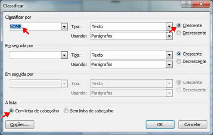 Na Caixa de Diálogo Classificar selecione as opções classificar por NOME, Crescente, Com linha de cabeçalho, e clique no botão OK, como mostra a imagem abaixo: