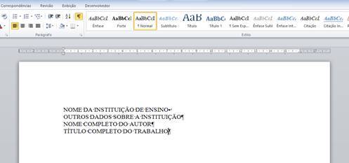 1) Digite o nome da Instituição (tudo em maiúsculo). O nome da Instituição deverá ser centralizado e pode até ser em negrito, mas faremos isso mais adiante, portanto, neste momento só digite o nome da instituição.