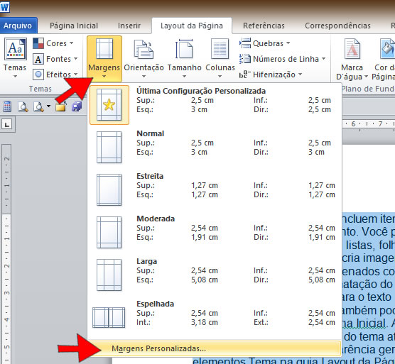 1-Na Guia Layout da Página, no Grupo Configurar Página clique em Margens e em seguida clique também em Margens Personalizadas...