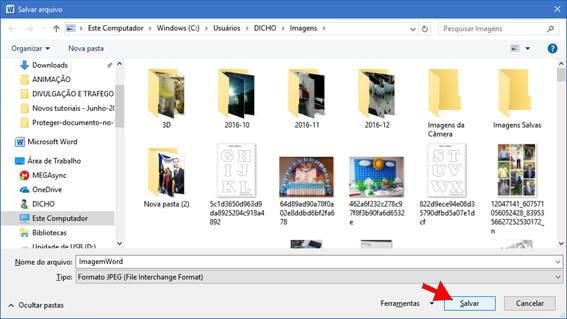 Selecione a pasta onde deseja salvar o arquivo e em Nome do arquivo: digite um nome para o arquivo de imagem que está sendo criado e em Tipo: selecione o formato de imagem desejado. Neste exemplo salvaremos dentro da pasta Imagem e daremos o nome de ImagemWord e selecionaremos o formato JPEG. Observe a imagem abaixo: